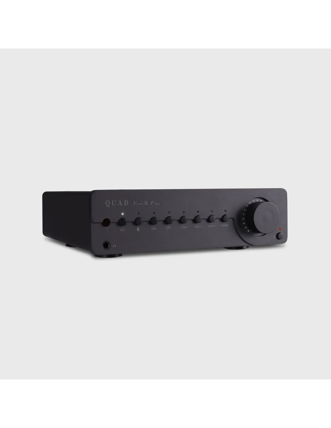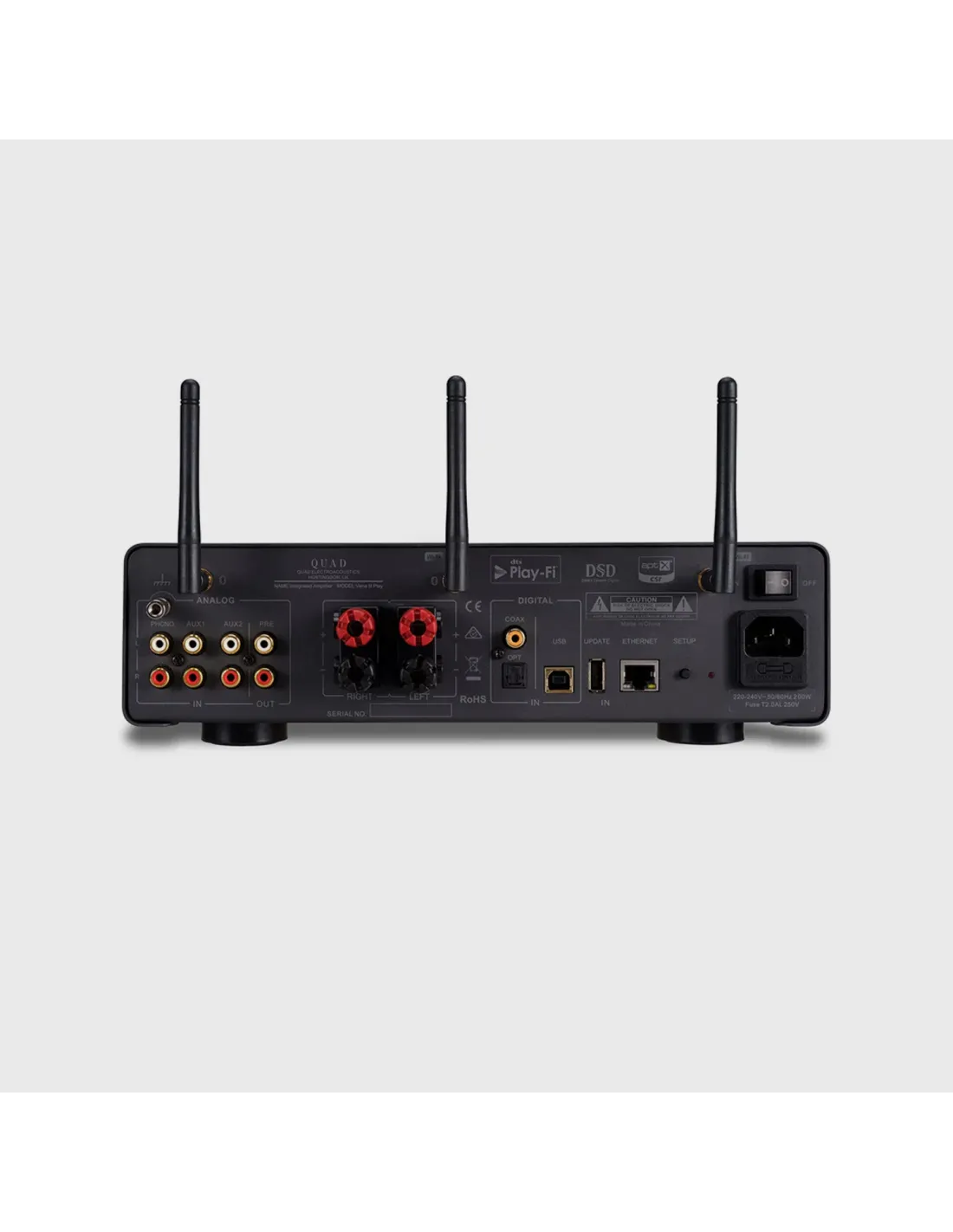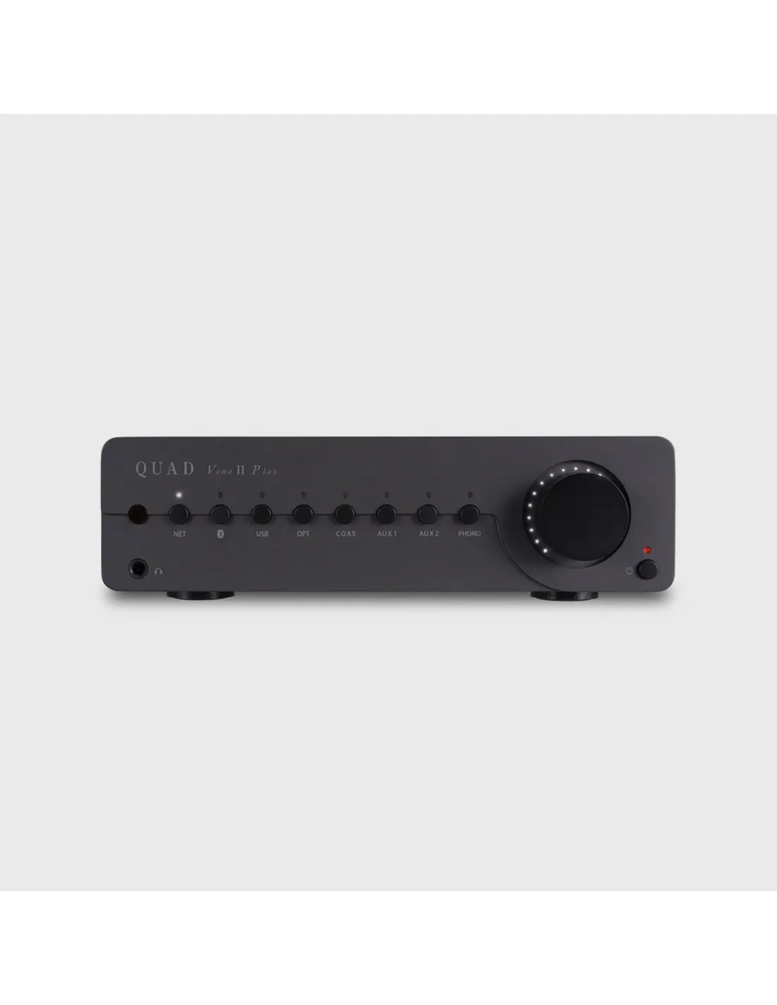 Quad Vena II Play è un amplificatore integrato stereo con streamer Wi‑Fi, potenza 2×45 W su 8 Ω (2×65 W su 4 Ω), DAC Sabre32 integrato, Bluetooth aptX, ingresso phono MM e numerosi ingressi digitali e analogici. Supporta lo streaming via rete con tecnologia DTS Play‑Fi, rendendolo perfetto per sistemi hi‑fi moderni e flessibili.