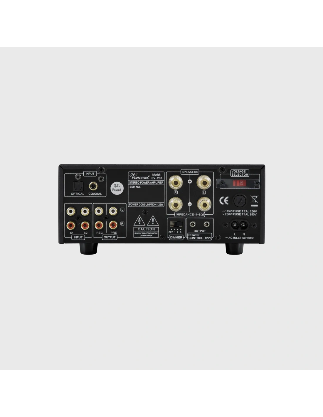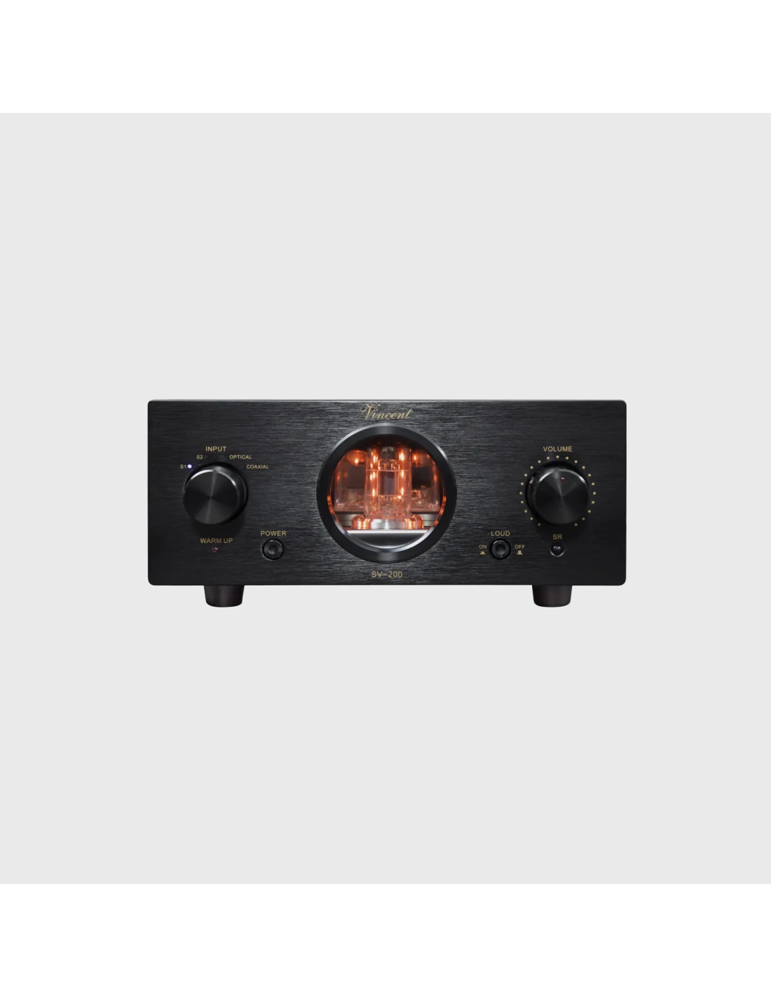 Vincent SV-200 è un amplificatore integrato compatto con due valvole 6N1, 2×25 W su 8 Ω (2×35 W su 4 Ω), Classe AB. Include ingressi analogici, ottico e coassiale, uscita pre-out, terminali speaker, con un suono trasparente e dinamico, ideale per diffusori compatti e ambienti domestici eleganti.