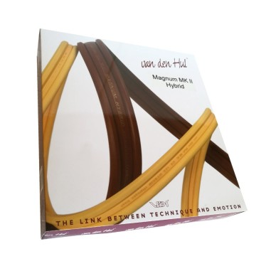 TERMINATED POWER CABLES IN ORIGINAL PACKAGE - FORK CONNECTORS VAN DEN HUL BERRI BUS - HYBRID CONDUCTORS 2 X 8.54 MM2 HIGH PURITY OFC MATCHED CRYSTAL COPPER COPPER HIGH DENSITY SILVER PLATED AND MULTIPLE LAYERS OF LINEAR STRUCTURED CARBON - TYPICAL RESISTANCE AT 20 DEGREES: 0.21 OHM/100 M - CAPACITANCE: 27 PF/M - HULLIFLEX OUTER JACKET - OUTER DIMENSIONS 21 X 6.5 MM - OUTER COLOR: DARK RED - DESTINATION: HIGH LEVEL AUDIO AND AUDIO VIDEO SYSTEMS - LENGTH 2.5 METERS