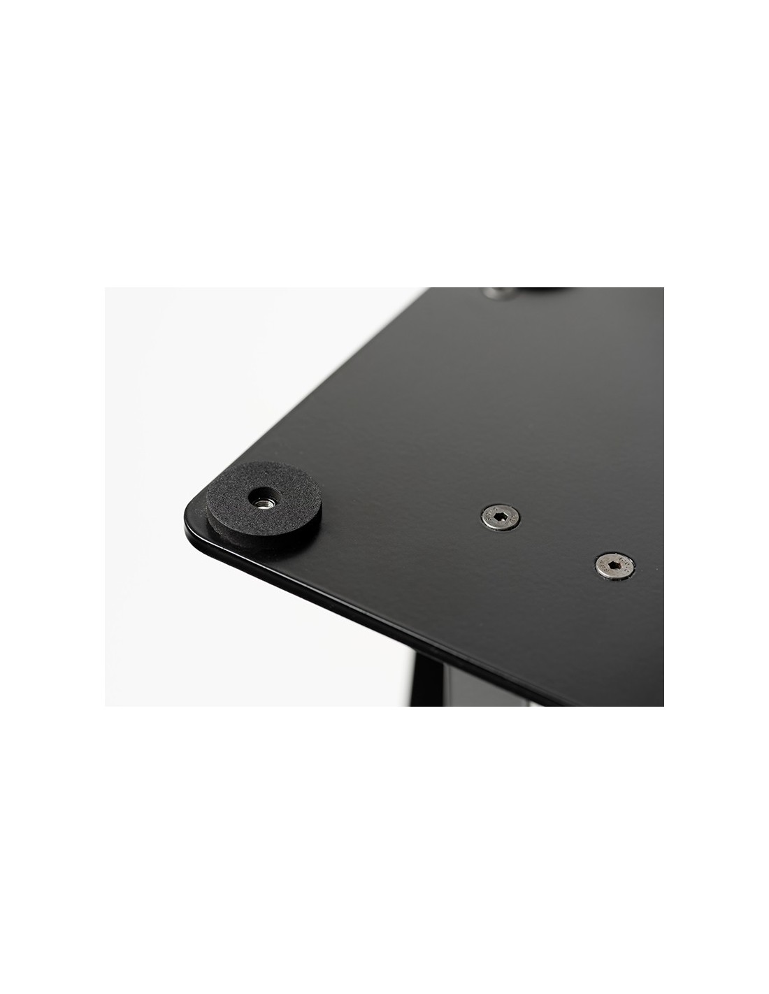Stand in acciaio per diffusori. Struttura a steli incrociati. Altezza 70cm. Dimensioni top plate 15x14,2cm con scelta tra punte o gommini per fissaggio diffusori. Base in acciaio disaccoppiata dal pavimento tramite 3 punte regolabili in altezza. Peso: 5Kg.