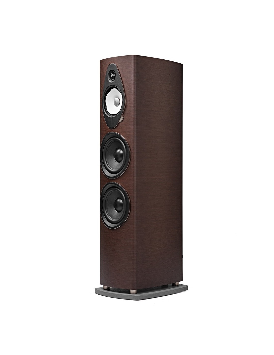 Collezione Sonetto G2, progettata e costruito artigianalmente in Italia, seconda generazione Sonetto completamente ridisegnata, caratterizzata da un design ispirato dalle forme della natura e costruito con materiali organici, ingegnerizzata con altoparlanti High-End proprietari dedicati e dotata di tecnologie acustiche desunte dal rivoluzionario sistema Suprema - diffusore da pavimento a 3 vie con midrange/tweeter in cassa chiusa e woofer con caricamento bass reflex - impedenza nominale 4 Ohm - sensibilità 90 db SPL (2.83V/1 m) - risposta in frequenza 33 Hz - 40 kHz - potenza applicabile consigliata compresa tra 50 e 400 Watt - cabinet rinforzato a forma di liuto, disegnato per assicurare un perfetto controllo delle risonanze interne e per ottimizzare le caratteristiche di dispersione - sezione delle frequenze medio-alte "La voce di Sonus faber", iconica incarnazione della filosofia progettuale e costruttiva del "Suono naturale" di Sonus faber, con tweeter e midrange montati in un'innovativa camera interna sigillata in sughero, modellata con tecnologie di precisione avanzate per ottenere una forma organica, priva di pareti regolari e capace di garantire un flusso continuo, armonico ed uniforme delle onde sonore, con un controllo accurato delle risonanze e una propagazione del suono di impareggiabile naturalezza e risoluzione - 1x tweeter a cupola morbida Silk Dome DAD (Damped Apex Dome) Arrow Point da 1,1" con membrana in seta, 1x midrange Camelia da 6,5" con membrana in carta a forma di fiore di camelia, esente dalle risonanze tipiche delle membrane di forma circolare, lasciata appositamente non dipinta per assicurare una purezza timbrica incontaminata, con rifasatore Phase Plug in alluminio capace di garantire una risposta in frequenza lineare sia in asse sia fuori asse - 2x woofer da 8" con coni a sandwich in polpa di cellulosa e profili a pattern floreale studiato per ridurre le interferenze, assicurare la massima linearità e aumentare la dispersione, dotati di cestelli pressofusi di forma organica e motori con anelli di demodulazione in alluminio, sintonizzati con condotti reflex orientati verso il pavimento - crossover anti risonante Hybrid IFF-Paracross, costruito con componenti Audiophile selezionati e impreziosito da speciali condensatori proprietari dedicati, comunione delle tecnologie brevettate Paracross Topology e IFF (Interactive Fusion Filtering), caratterizzato da un filtraggio speciale degli altoparlanti basato su uno slope progressivo accelerato, efficace nel ridurre le forze elettromotrici di ritorno (Back EMF) e la sensibilità del circuito alle interferenze da radiofrequenza, coadiuvato dalla tecnologia Phase Coherent, calibrata per assicurare una sincronizzazione precisa delle rotazioni di fase dei driver, un allineamento meticoloso che restituisce una scena sonora estremamente realistica, definita e tangibile - solida e stabile base anti vibrazioni in cemento con punte coniche - griglie parapolvere individuali per ciascun altoparlante - elegante tappo di copertura e protezione dei connettori, predisposti per bi-amping e bi-wiring - raffinatissima finitura Wenge in legno a poro aperto con texture del top a 45 gradi, flangia dei medio-alti rivestita in vera pelle nera e ring metallizzati intorno ai driver - dimensioni (L x A x P) 334 x 1179 x 480 mm - peso 45 Kg