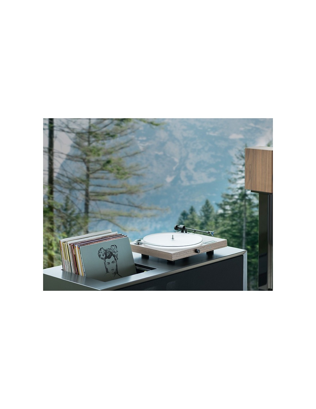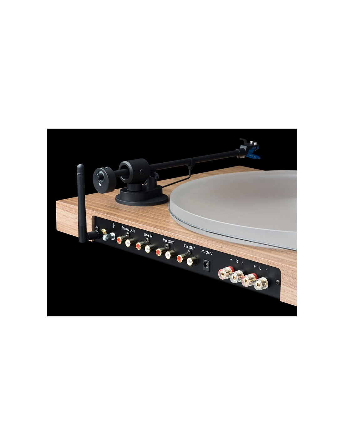 Giradischi all-in-one amplificato compreso di braccio da 8,6" in alluminio e di testina Pro-Ject PICK IT 25A. Piatto in acrilico. Manopola del volume sul frontale e display sulla parte superiore. Bluetooth. Amplificatore da 2 x 50W su 4ohm, 1 ingresso linea RCA. 2 uscite record out RCA, 1 fissa e 1 variabile. 1 uscita Phono. Morsetti di uscita per i diffusori dorati. Telecomando in dotazione. Coperchio parapolvere in dotazione. Disponibile nelle finiture: Noce (Walnut) o Eucalipto. Peso: 5Kg.