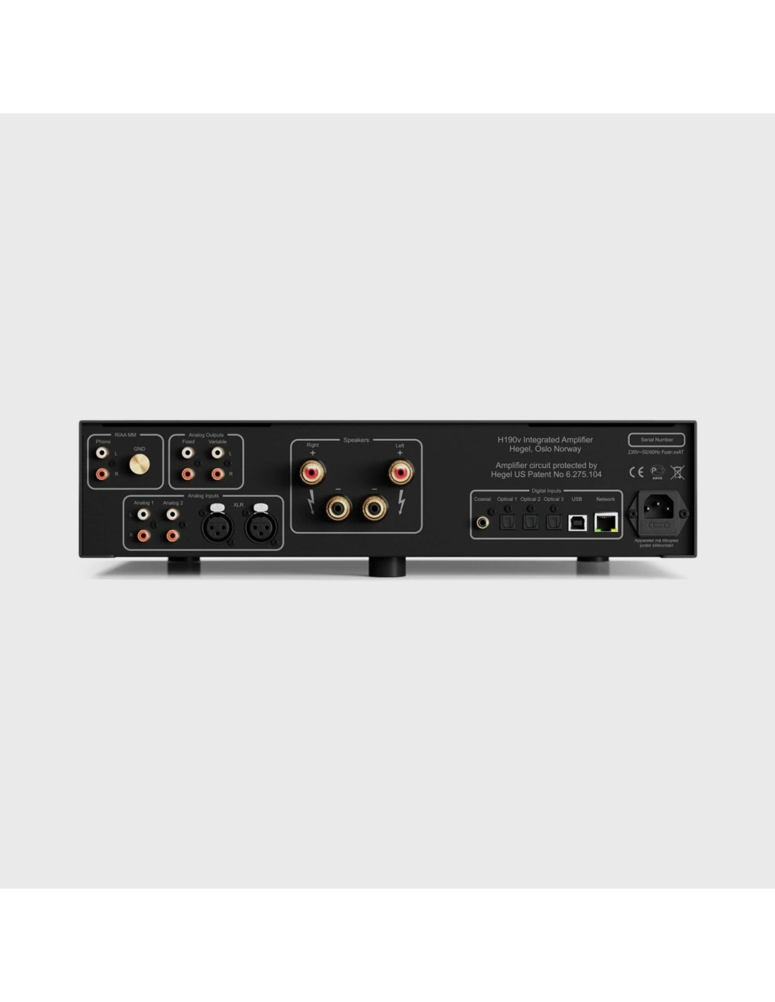 Sul retro dell'H190V si trova molto con cui giocare nel dominio digitale con tre ingressi ottici, un coassiale, un USB ed un Ethernet - ingresso di rete (anche per l'audio) - che riflette il progressivo dilagare degli ascoltatori verso le sorgenti digitali: trasporti CD, Streamer, laptop ad alta risoluzione, TV per coloro che dispongono di configurazioni home cinema. Per quelli che amano ancora l'analogico e non vogliono rinunciare al fascino del vinile, troviamo un ingresso Phono MM di grande qualità derivato direttamente dal loro pluri-premiato preamplificatore phono Hegel V10. Troviamo poi una coppia di ingressi bilanciati (XLR) e due coppie di RCA sbilanciati. Sono disponibili anche un'uscita di linea e un'uscita sbilanciata variabile. L'H190V viene fornito con un cavo di alimentazione IEC standard (idealmente upgradabile con un buon cavo di corrente per HiFi) ed un telecomando in metallo molto solido.