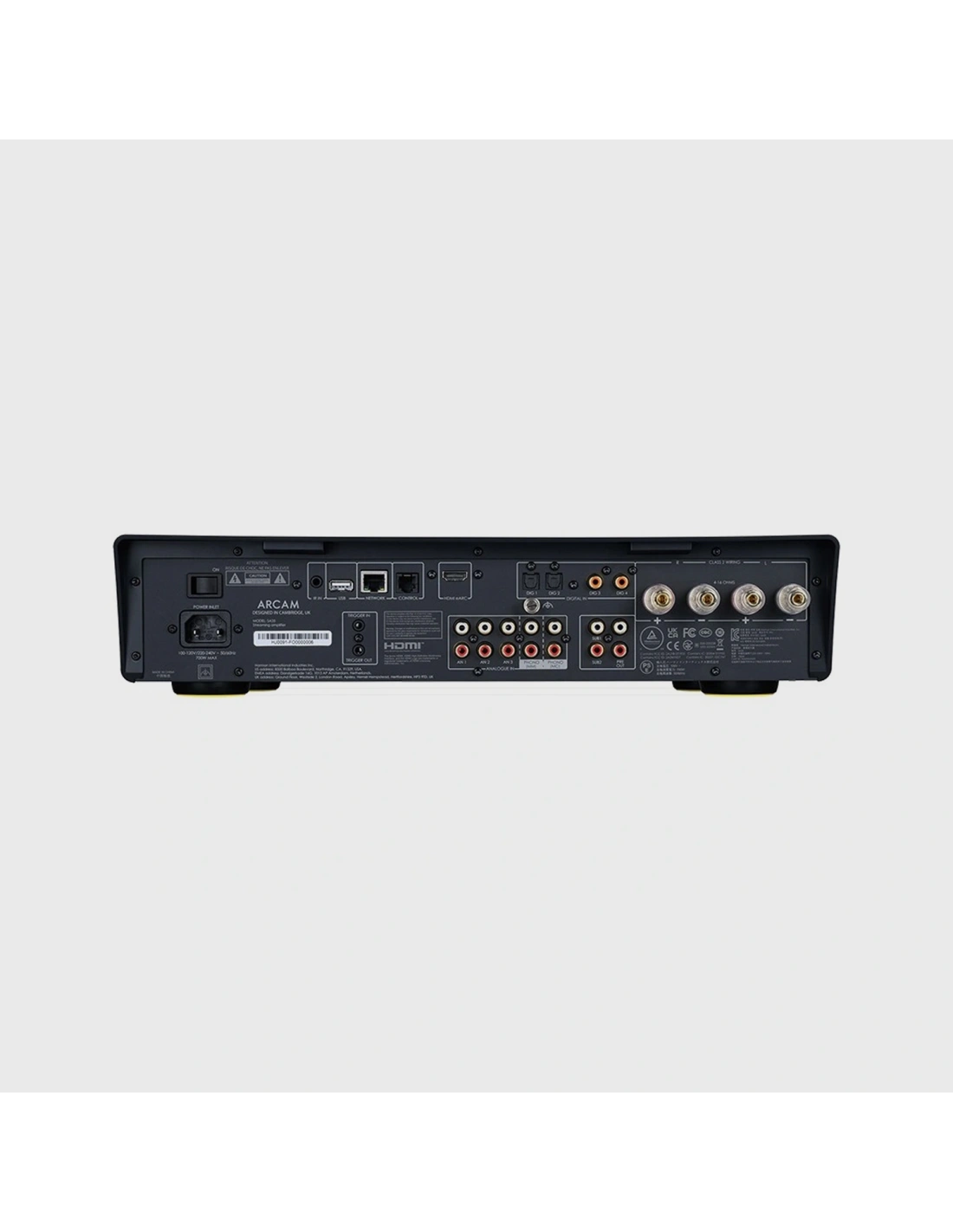 L'Arcam SA35 vanta un corredo di connessioni che lo rende estremamente versatile. Oltre ai tre ingressi analogici RCA e allo stadio fono dedicato sia per testine MM che MC, il pannello posteriore ospita ingressi digitali ottici e coassiali, oltre a una porta HDMI eARC per la connessione diretta con la TV. La connettività wireless è completa di AirPlay 2, Chromecast e Bluetooth aptX™ Adaptive bidirezionale. L’integrazione nell'impianto è facilitata dall'app Arcam Radia, che permette l'accesso immediato a Tidal, Qobuz e Spotify. L'uscita subwoofer e il pre-out completano un quadro di flessibilità operativa che permette al sistema di crescere ed evolversi nel tempo.