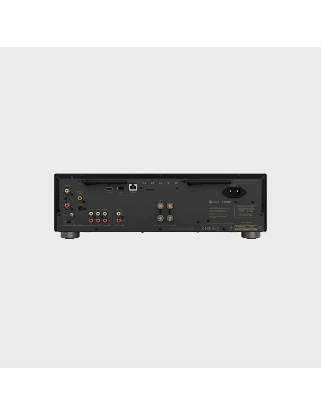 Nonostante la completezza estrema, l'Onkyo Icon A-50 è un amplificatore stereofonico puro a 2 canali, pertanto non supporta configurazioni multicanale Surround (come 5.1 o Dolby Atmos). Sebbene il sistema Dirac Live® sia incluso, la versione "Full Bandwidth" potrebbe richiedere una licenza opzionale a seconda dei mercati. Infine, non sono presenti ingressi bilanciati XLR, preferendo un'architettura sbilanciata RCA di altissima qualità per mantenere la massima coerenza circuitale.