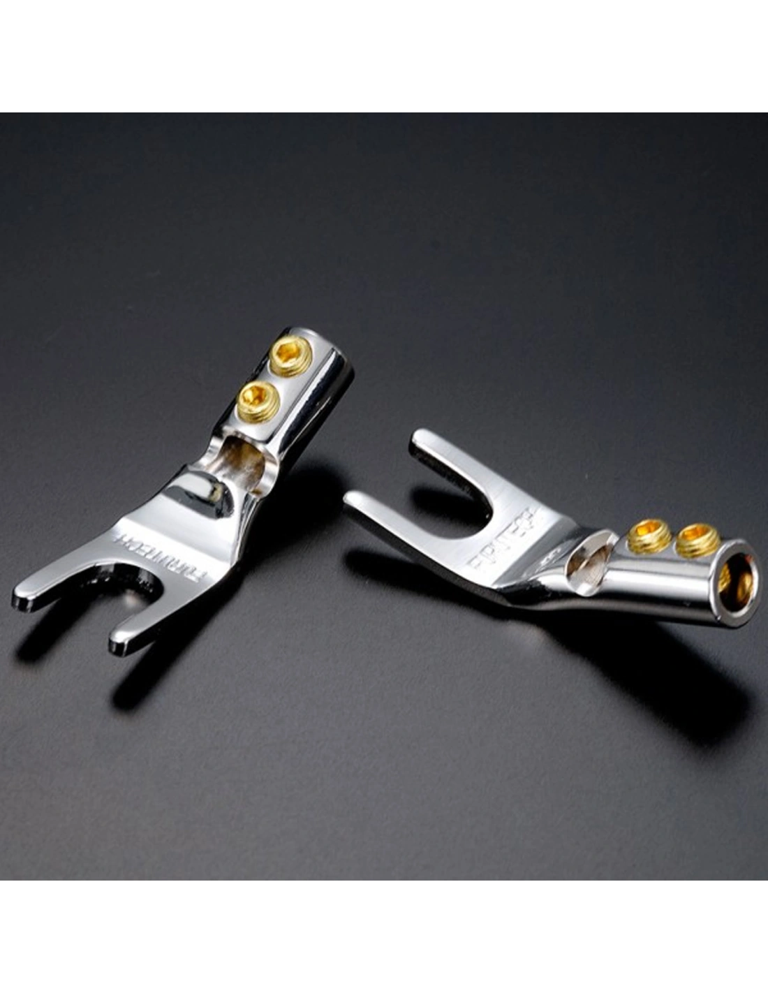 Sistema di Fissaggio Versatile e Sicuro Le FP-201 sono progettate per un'installazione flessibile e duratura. Il sistema di fissaggio permette sia la crimpatura tramite doppie viti (ideale per una connessione meccanica rapida e solida) sia la saldatura, o una combinazione delle due tecniche per la massima integrità elettrica. L'ampia apertura della forcella (8,2 mm) assicura la compatibilità con la stragrande maggioranza dei morsetti per diffusori e amplificatori presenti sul mercato.