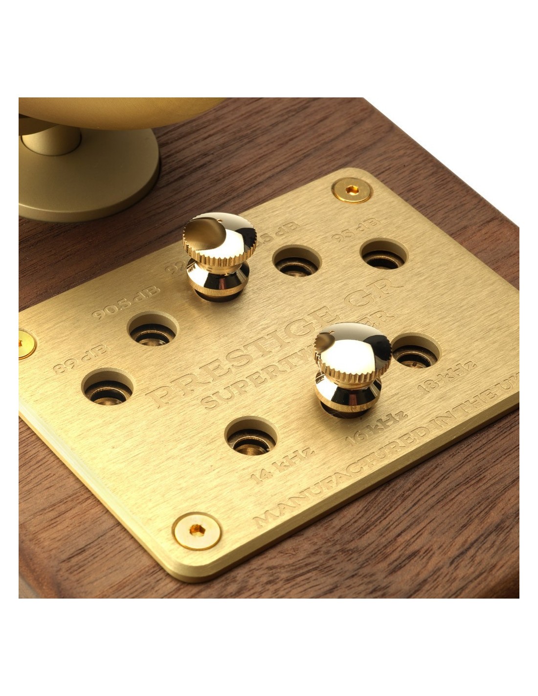 SUPERTWEETER ESTERNO DEDICATO ALLA SERIE PRESTIGE - CROSSOVER REGOLABILE A 14 KHZ, 16 KHZ, 18 KHZ - SENSIBILITA' REGOLABILE A 89 DB, 90,5 DB, 92 DB, 93,5 DB, 95 DB - IMPEDENZA NOMINALE 8 OHM - RISPOSTA IN FREQUENZA ESTESA FINO A 100 KHZ (62 KHZ A -6 DB) - TWEETER DA 25 MM A CUPOLA IN LEGA DI MAGNESIO SPESSA 44 MICRON E MOTORE IN NEODIMIO - CROSSOVER ALLO STATO DELL'ARTE CON INDUTTORI AVVOLTI IN ARIA LIBERA E RESISTORI NON INDUTTIVI A STRATI DI OSSIDO DI METALLO SU SUBSTRATI DI CERAMICA - CABLAGGIO INTERNO IN PURISSIMO RAME MATCHED CRYSTAL OFC PLACCATO ARGENTO - TWEETER ORIENTABILE VERTICALMENTE - CONNETTORE DI MASSA ADDIZIONALE - DESIGN ISPIRATO AI MICROFONI DA TAVOLO TANNOY DEGLI ANNI '50 - FINITURA IN NOCE TRATTATO AD OLIO E PARTI METALLICHE IN ALLUMINIO CNC ANODIZZATO DORATO - DIMENSIONI (L X A X P) 147 X 131 X 207 MM