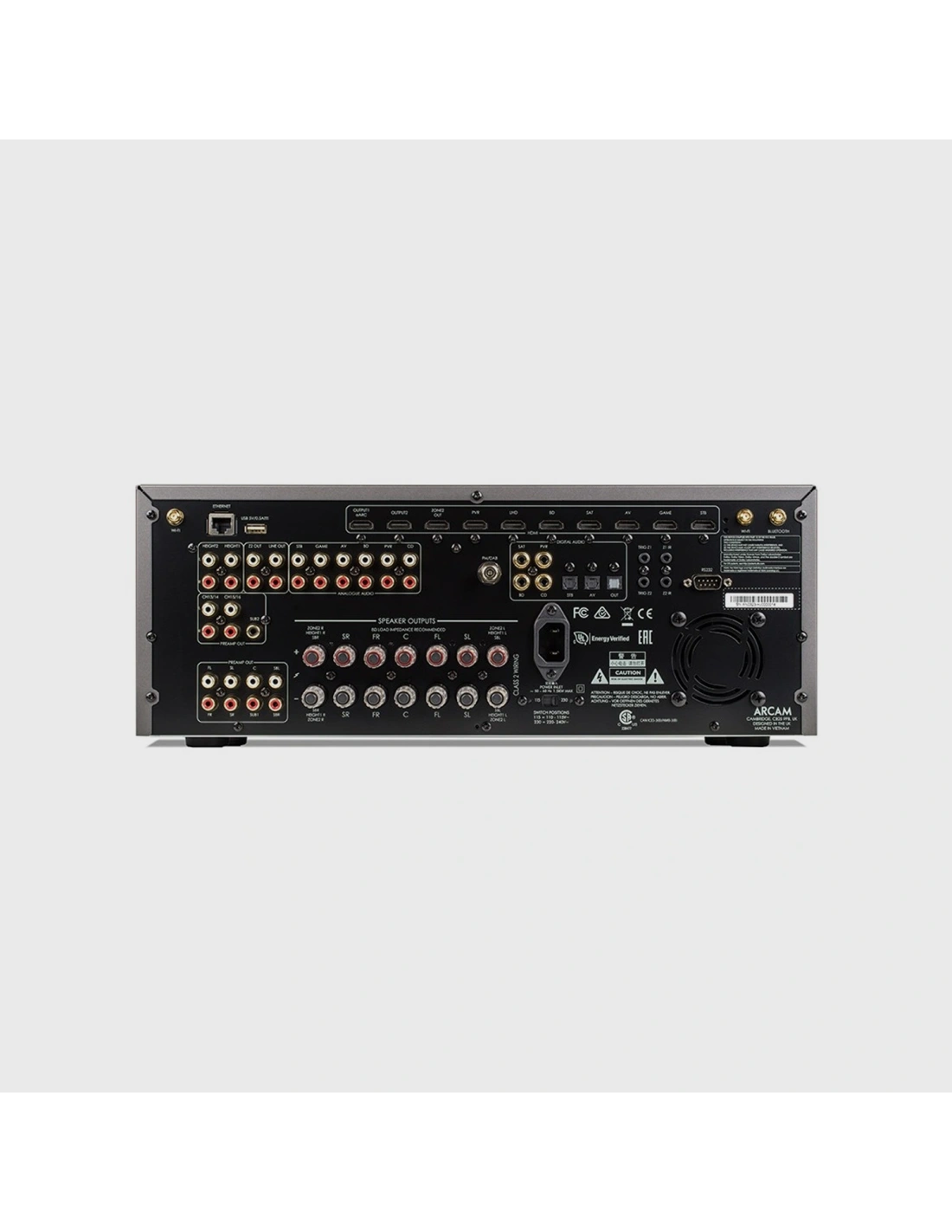L'Arcam AVR21 focalizza le proprie risorse sulla qualità della riproduzione e dell'amplificazione interna, ma non include un ingresso fono dedicato ai giradischi, richiedendo l'uso di un pre-phono esterno. Sebbene disponga di 16 canali di elaborazione, gli stadi di amplificazione interna sono 7; per realizzare impianti con più di 7 diffusori (come un 7.1.4 o 9.1.6), è indispensabile l'acquisto di finali di potenza separati. Non sono presenti ingressi o uscite bilanciate XLR, mantenendo una gestione del segnale sbilanciata su connettori RCA di alta qualità.