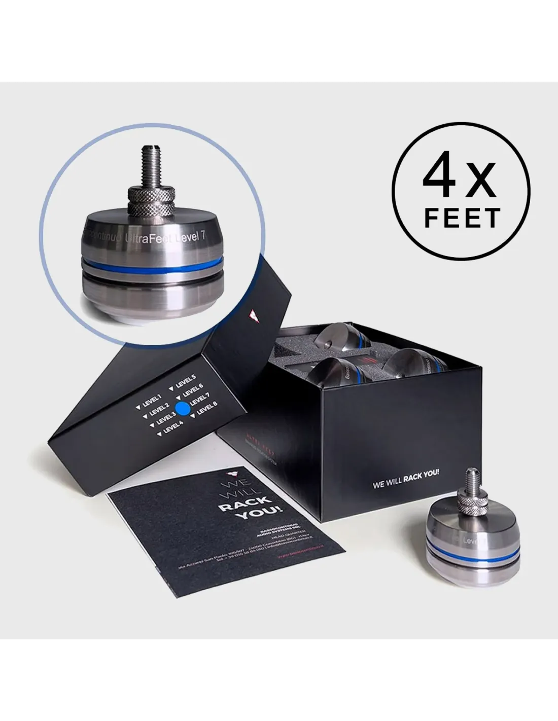 Il kit Level 7 è specificamente ottimizzato per carichi pesanti, con una capacità di supporto compresa tra 100,4 e 200 kg per il set completo. La versatilità è garantita dalla fornitura di tre diverse misure di adattatori di filettatura (M8, M10 e M12), rendendo questi accessori compatibili con un'ampia gamma di diffusori high-end. Sostituendo i piedini o le punte originali con gli Ultra Feet Level 7, si ottiene un controllo totale dell'energia vibrazionale, trasformando radicalmente la resa dinamica del proprio sistema audio.